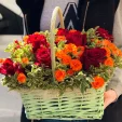 Уменьшенный: роза оранжевая - 3 шт., гербера оранжевая - 4 шт., гиперикум - 2 шт., декоративная зелень, оазис, корзина малая.